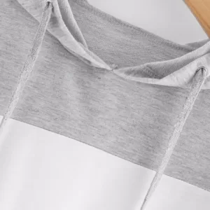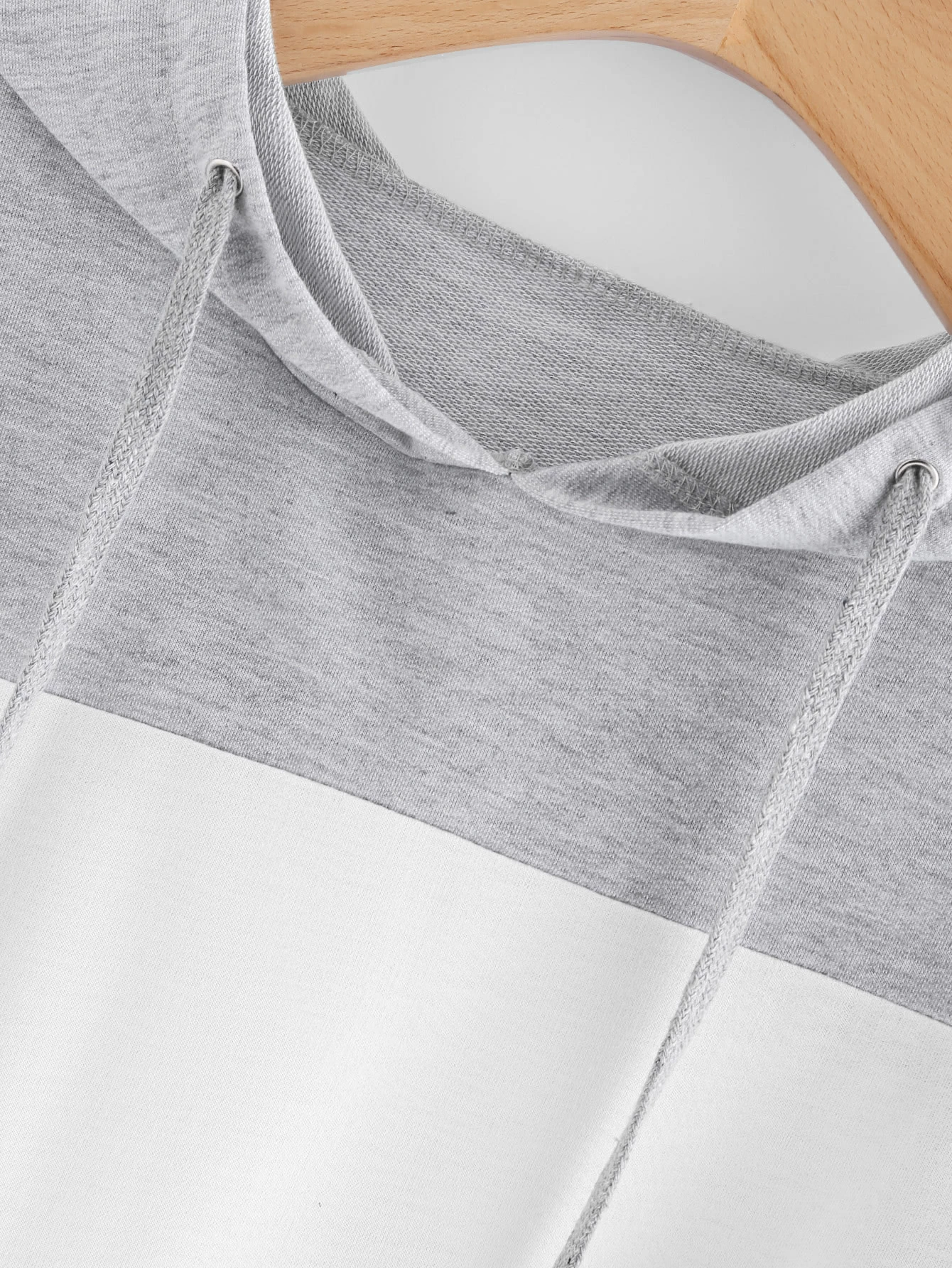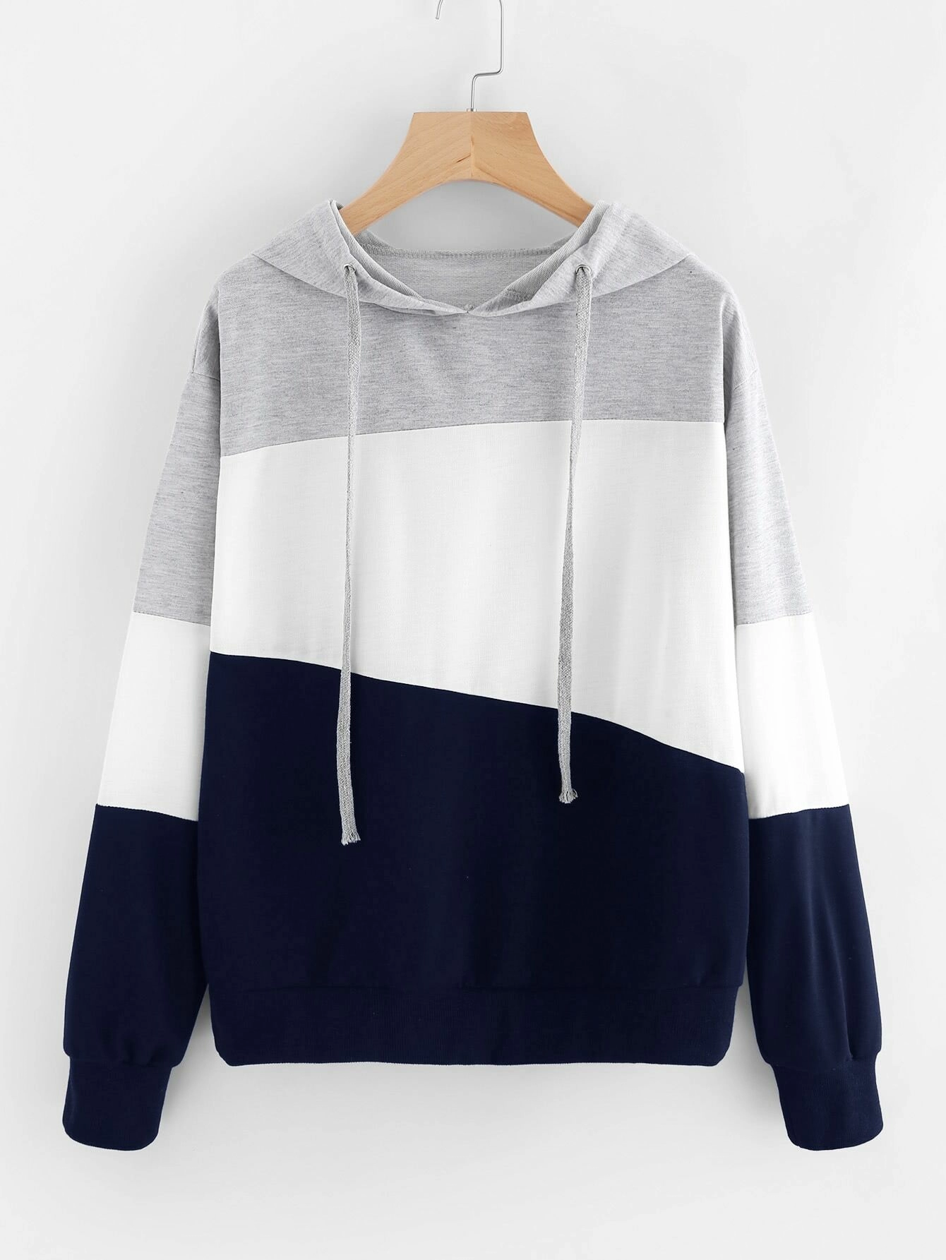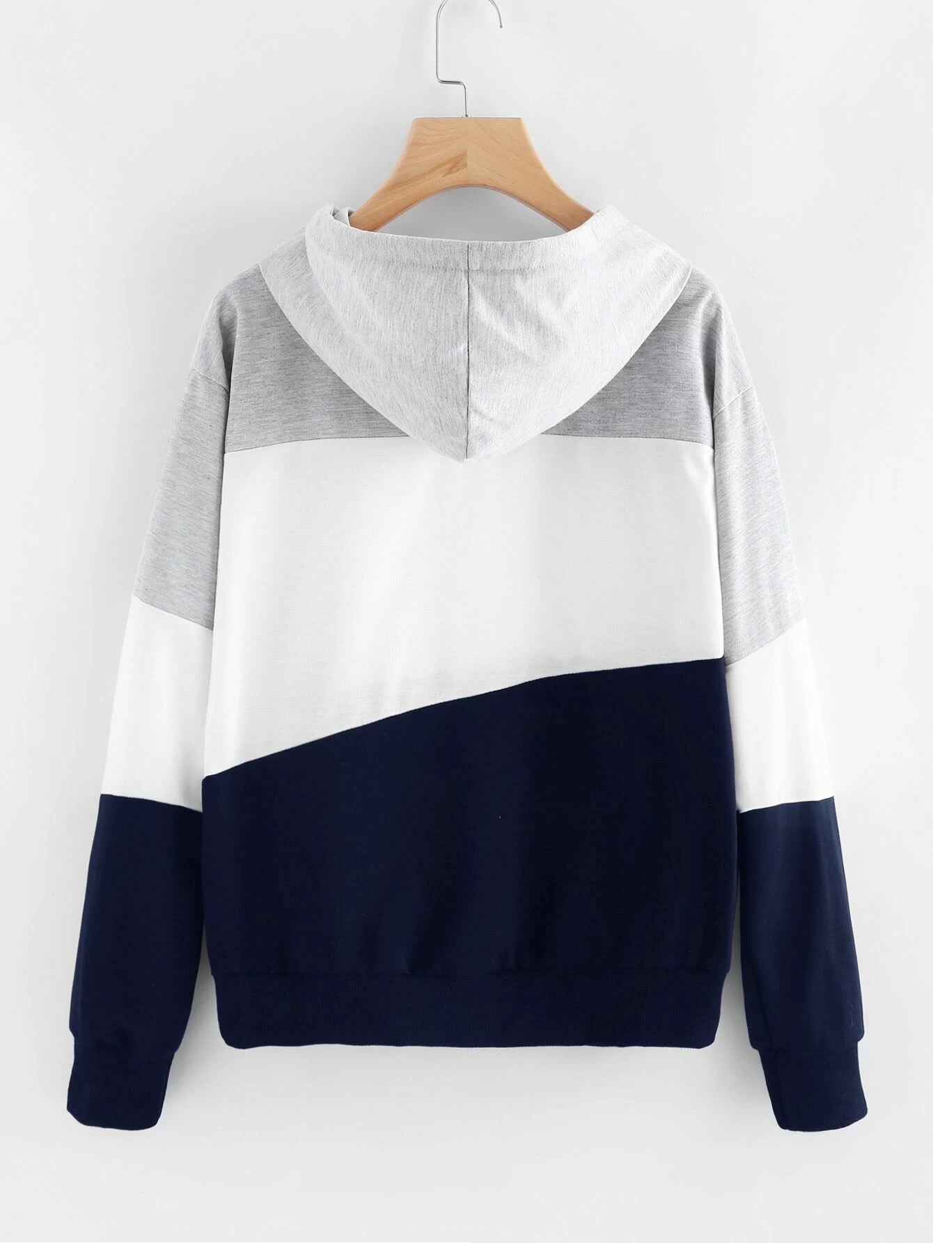 Sudadera oversize en color combinado plomo, blanco y azul marino, con bolsillo delantero y detalle bordado.